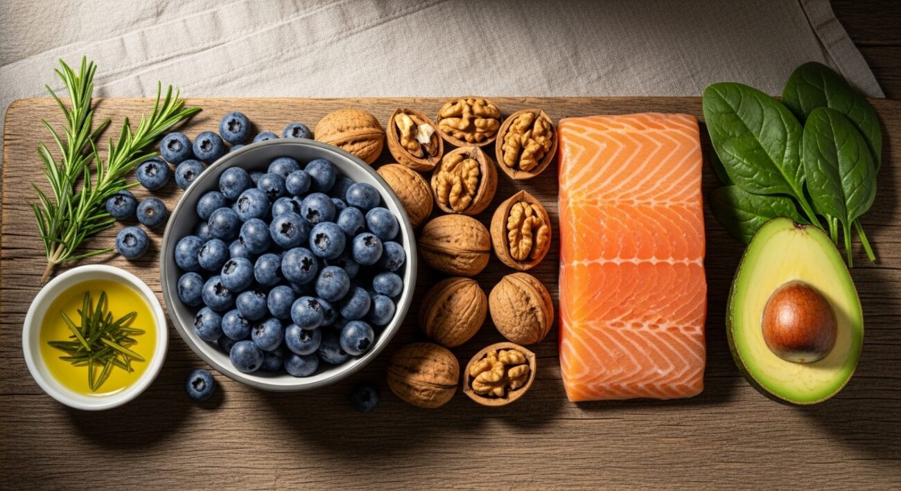 Kluczowe są kwasy tłuszczowe Omega-3 (tłuste ryby, orzechy), antyoksydanty (jagody, szpinak), witamina K i luteina (warzywa liściaste), cholina (jajka) oraz pełnoziarniste produkty. Należy unikać nadmiaru cukru i przetworzonej żywności.