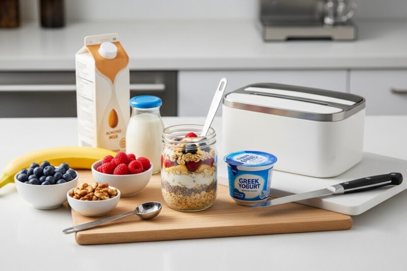 • Śniadanie: Owsianka na mleku roślinnym z owocami jagodowymi i nasionami chia.