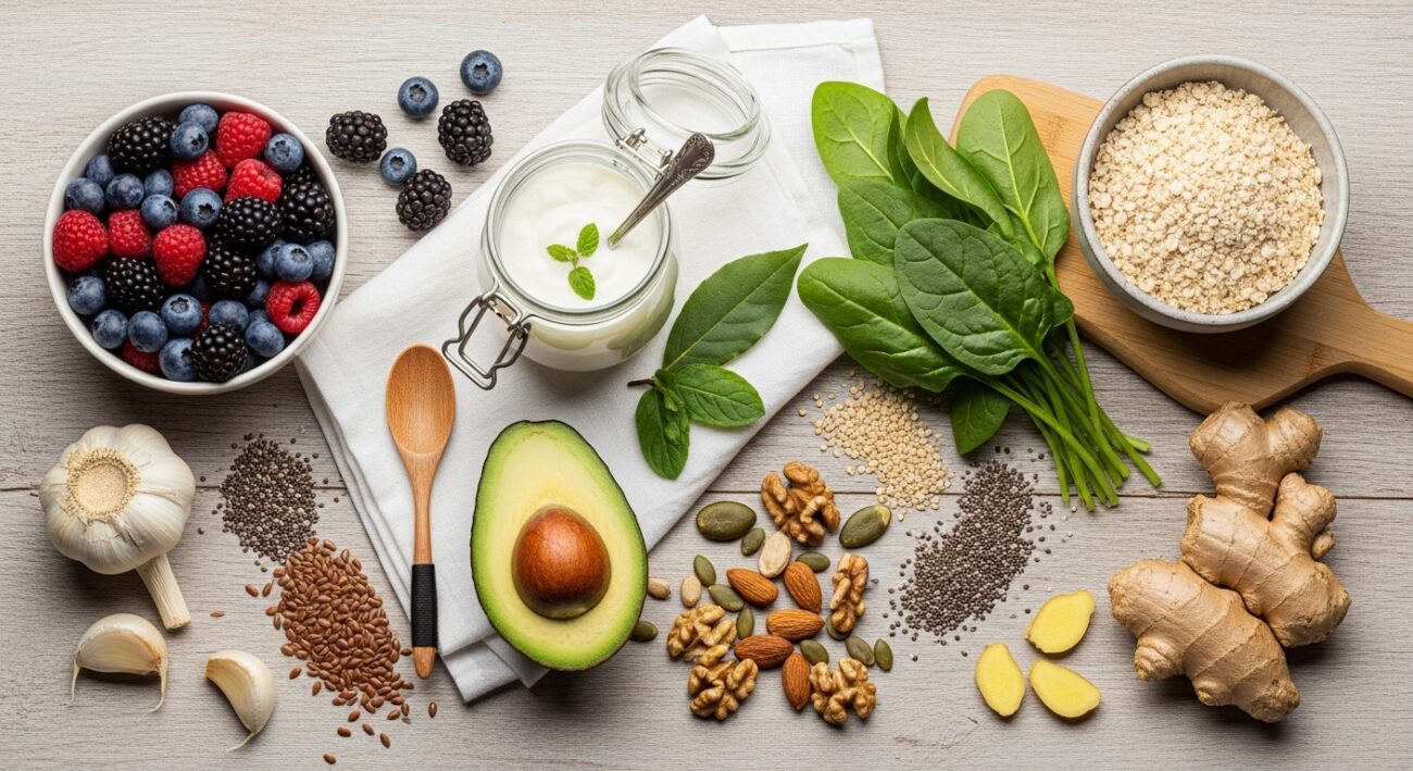 Probiotyki to „dobre” bakterie i drożdże wspierające równowagę mikroflory jelitowej. Znajdują się w fermentowanych produktach mlecznych (jogurt, kefir), kiszonkach (kapusta, ogórki), kimchi, kombuchy i chlebie na zakwasie.